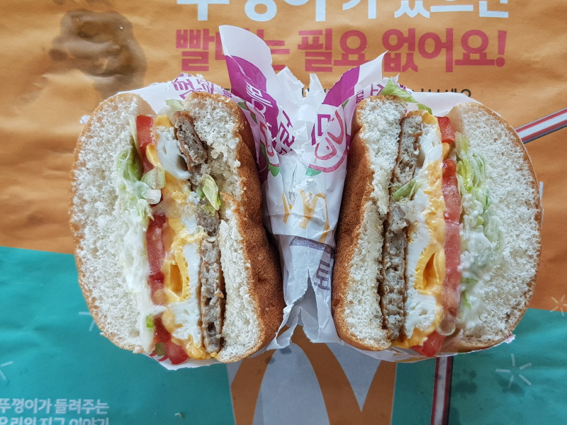 맥도날드의 다른 맥머핀보다는 뚜렷하게 두께감이 있고, 베이컨 토마토 에그 소프트번보다도 좀 더 도톰한 거 같은 느낌이에요.