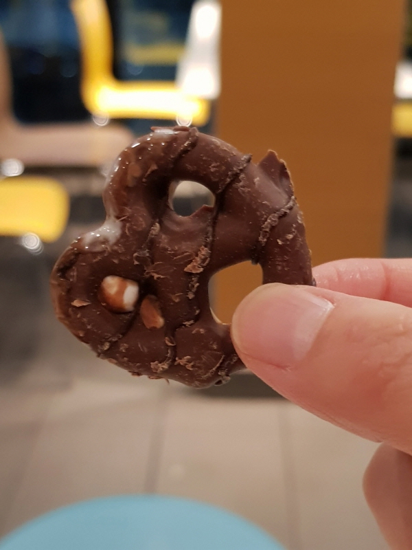프레첼은 초코 코팅이 되어있긴 하지만 소금 알갱이가 겉면에 붙어있어요.
