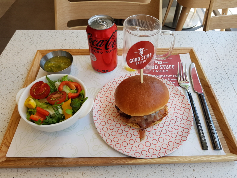 원래 햄버거를 감자튀김보다 샐러드랑 먹는 걸 더 좋아하기도 하고, 'NOT FAR FROM THE FARM’ 이라는 굿 스터프 이터리의 컨셉에 잘 맞기도 하고요.