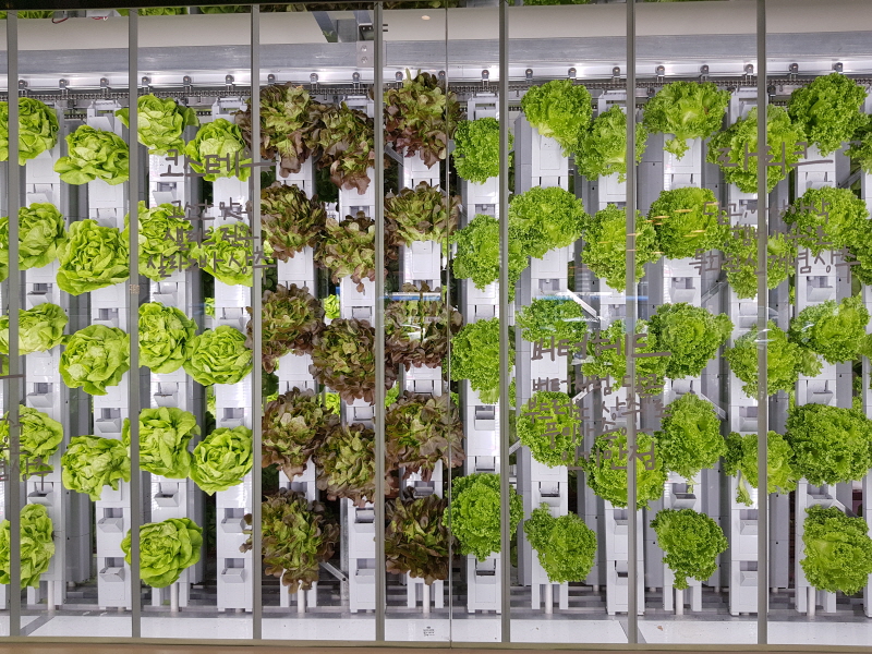 매장에 GT 팜 시설을 설치해놓고, 버터헤드레터스나 로메인, 토마토, 바질, 루꼴라, 고수 등 12가지의 채소를 수경재배로 키우고 있다고 해요.