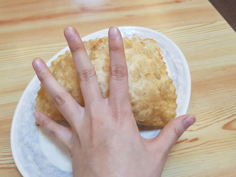 그러면서 두께는 얇아서 크기가 엄청 큰 납작만두 같다는 생각도 들었어요.