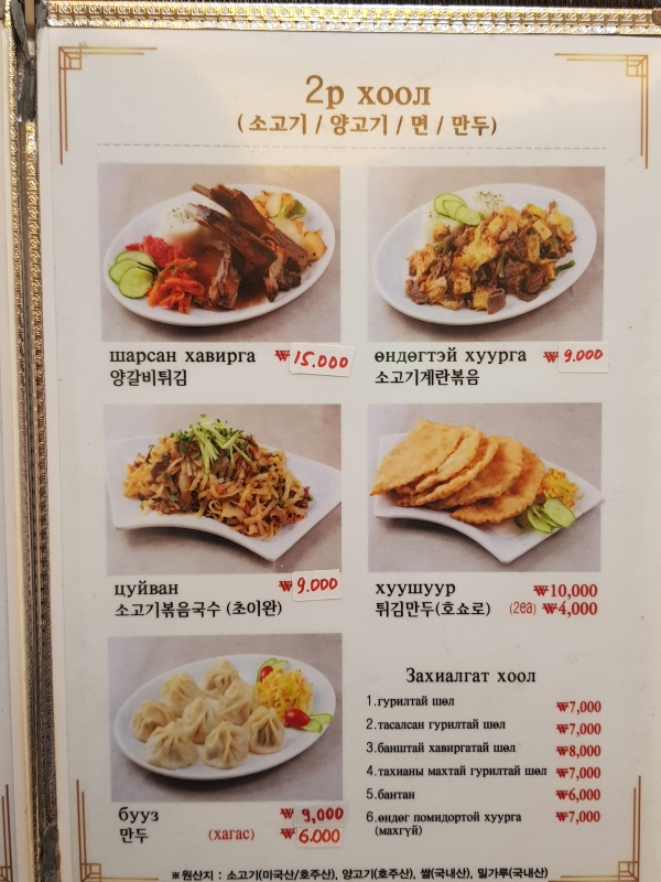 몽골어이긴 하지만, 사진과 한국어 표기가 병행되어 있고 일하시는 분들이 한국어를 잘하시기 때문에 주문이 어렵지는 않아요.