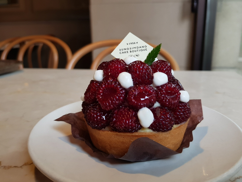 너무 맛있어 보이는 타르트가 많아서 고민에 고민을 거듭하다 고른 메뉴는 산딸기 듬뿍 타르트예요.