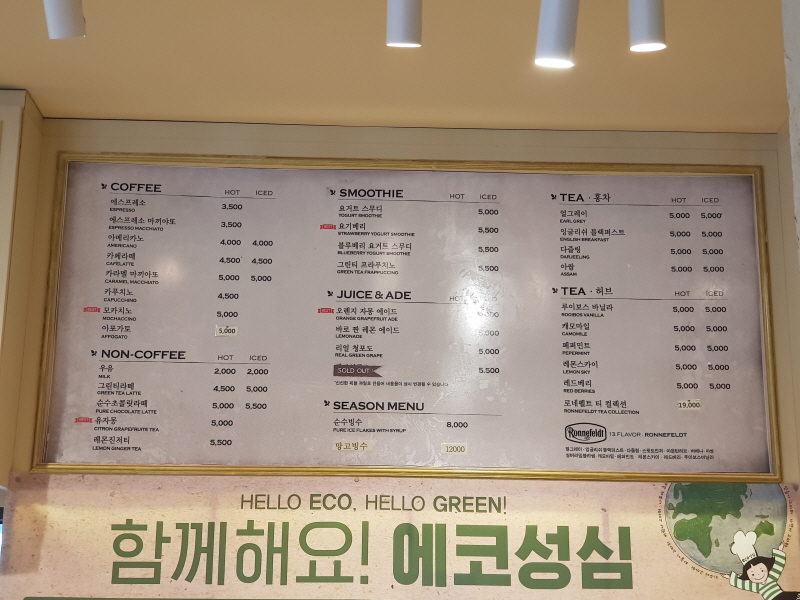 아메리카노가 4천원, 카페라떼가 4,500원 정도로 일반 카페와 비슷한 수준입니다.