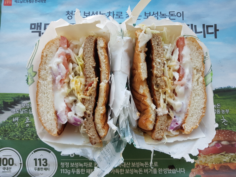 제품 광고에서 보성 차밭이 나와서 녹차 소스 같은 걸 끼얹거나 녹차 페스토 같은 게 들어가나 싶었는데 그건 아니고, 전남 보성의 녹차잎 사료로 충청 지역의 농상에서 키워낸 보성녹돈 패티가 들어간다고 해요.