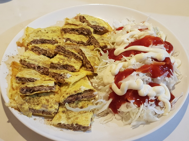 계란지단을 부쳐서 버거 패티를 돌돌 말은 후, 후추를 톡톡 뿌려서 나왔어요.