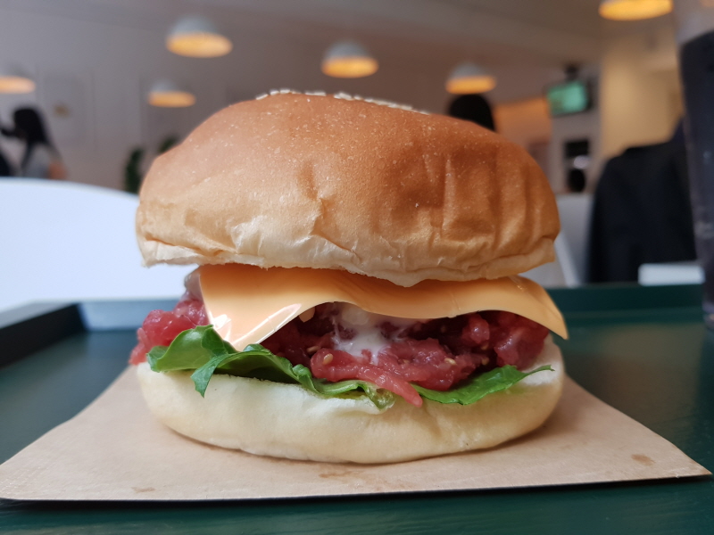 한 가지 센스가 있다고 생각한 점은 슬라이스 치즈와 양상추를 번에 바로 붙여놓고 그 사이에 육회를 넣었다는 점이에요.