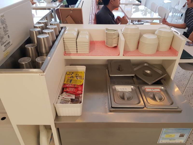케첩, 머스터드 등은 일회용품으로 제공되고, 분식집도 같이 하다보니 김치, 단무지도 셀프로 가져다먹을 수 있습니다.