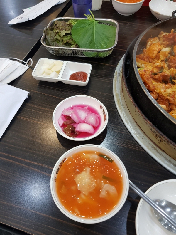 기본 반찬으로는 물김치와 양파피클, 쌈장과 마늘, 쌈채소가 나옵니다.