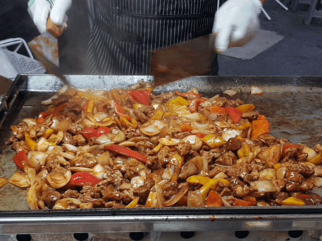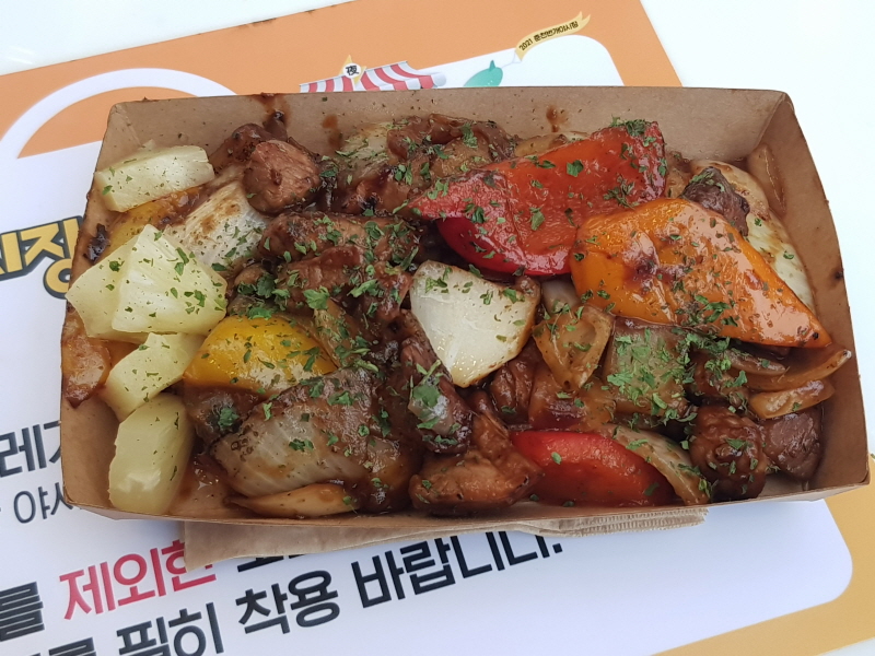 메뉴는 삼겹살 숙주볶음, 순대볶음, 닭꼬치, 떡볶이, 새우튀김, 탕수육, 치킨 등등이었어요.
