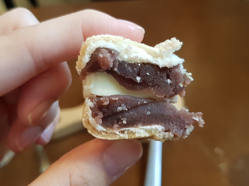 찹쌀모나카의 깍지에다가 팥 앙금을 두 겹으로 넣고 그 안에는 버터 조각을 넣었어요.