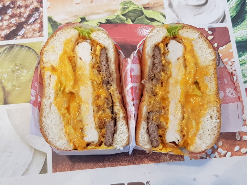 쇠고기 패티는 와퍼 주니어 패티인 거 같고, 치킨패티는 킹치킨버거 종류에 사용하는 것과 동일한 것으로 보여요.