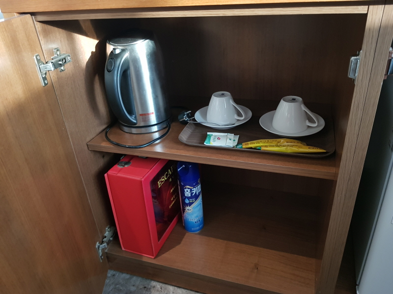 커피포트와 커피잔, 헤어드라이기, 에프킬라가 구비되어 있습니다.