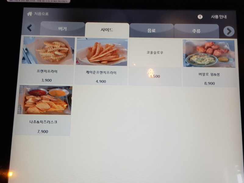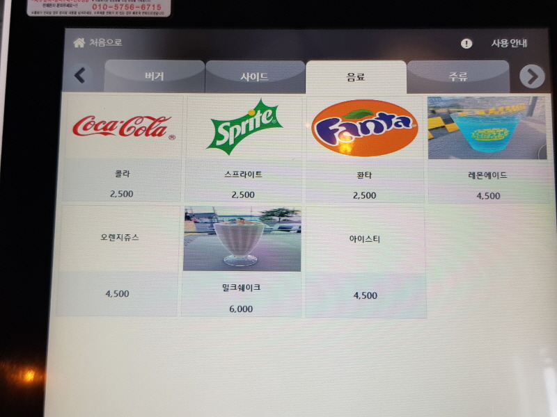 4,500원을 추가하면 탄산음료 + 프렌치 프라이 구성의 세트로 주문이 가능하지만, 저는 단품에 음료만 따로 주문했어요.