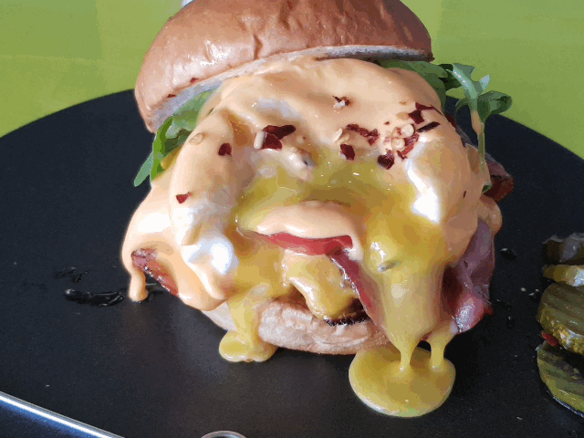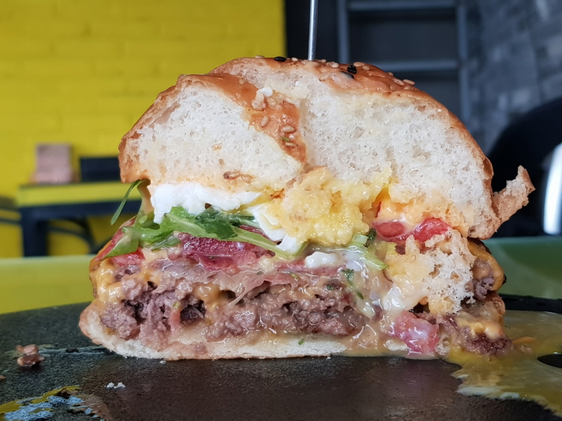 번에 쇠고기 패티, 아메리칸 치즈, 수란, 베이컨, 토마토, 루꼴라, 멜팅치즈소스, 오렌지 마멀레이드로 구성되어 있어요.