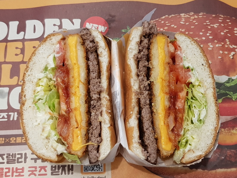 이번에 출시된 골든 치즈렐라 와퍼는 치즈 패티가 모짜렐라 치즈와 체다 치즈를 섞었다고 해요.