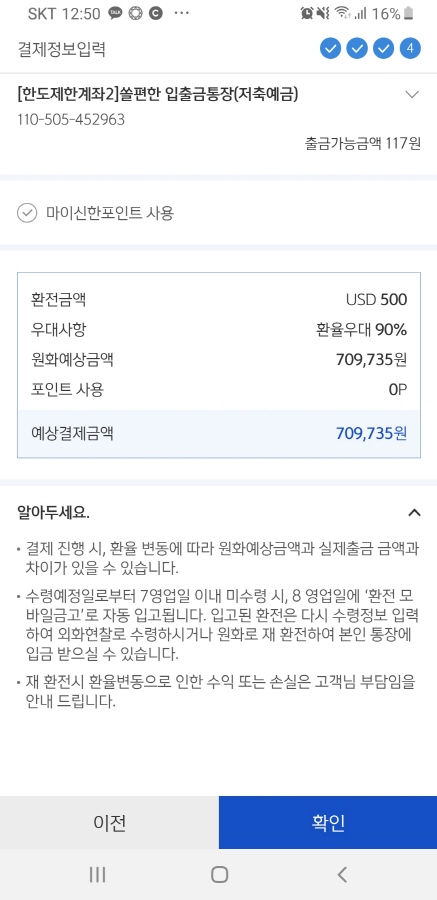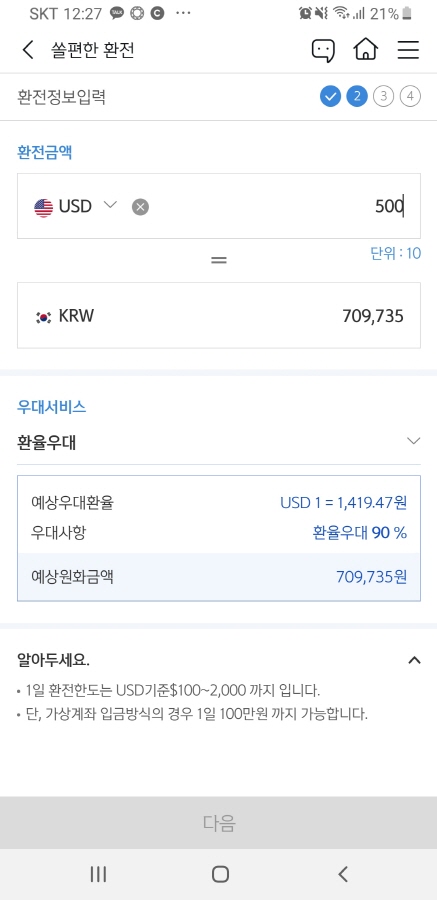 신한은행 SOL 어플리케이션을 통해서 환율 우대 받고 당일 환전했습니다.