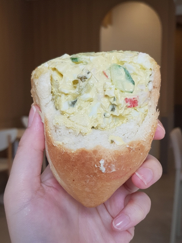 바게트의 끝부분을 잘라서 속을 파낸 계란감자 샐러드를 채워넣어서 만든 메뉴예요.