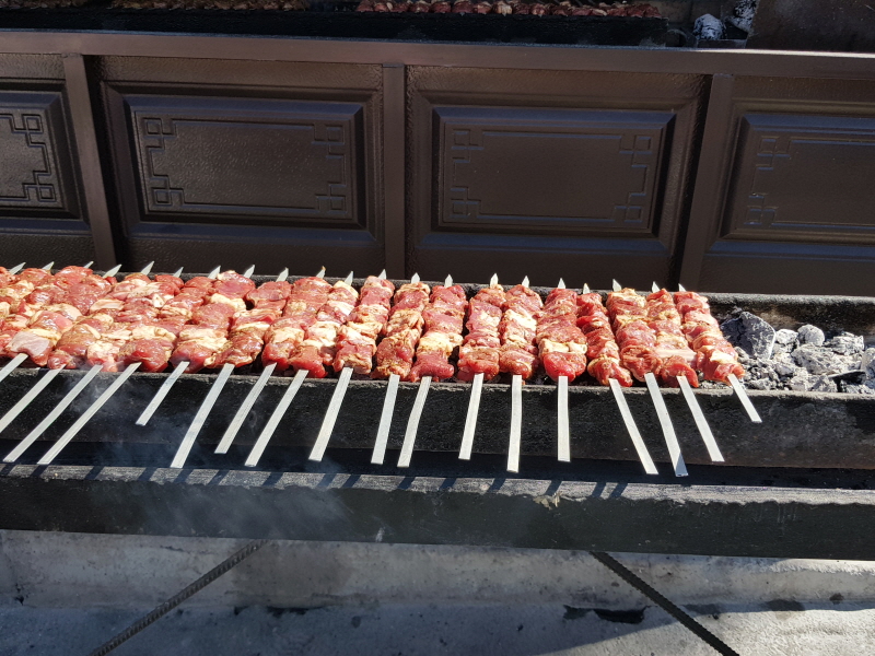 양고기 샤슬릭인데, 야외에서 직화로 굽는 모습을 바로 볼 수 있습니다.
