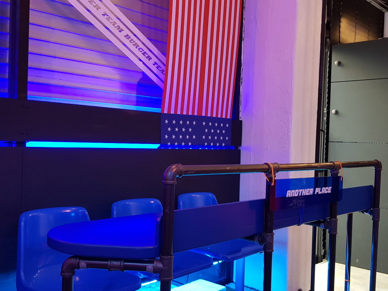매장에서는 미국 야구팀 느낌의 인테리어와 소품들이 있어요.