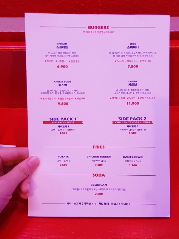 버거는 스프레드, 스파이시, 치즈밤, 카르보, 이렇게 4가지이고, 팩은 있으나 세트 구성은 따로 없는 거 같아요.