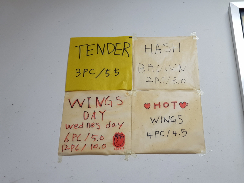 사이드도 프라이와 해쉬브라운, 핫윙, 치킨텐더, 이렇게 딱 4가지이고요.