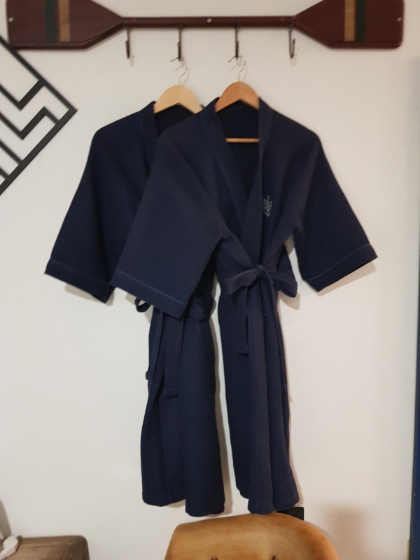 간단한 일회용품과 헤어드라이기, 가운이 비치되어있어요.