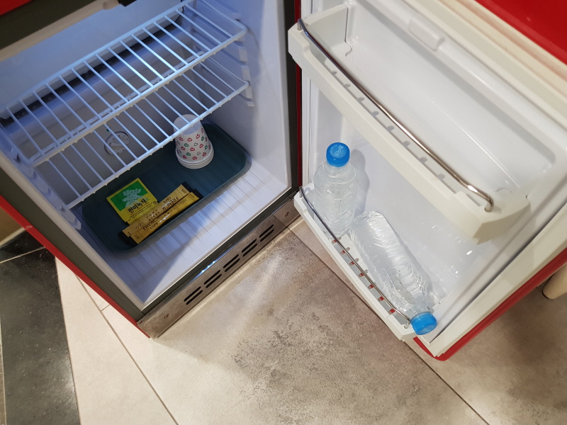 냉장고는 SMEG 였는데, 안에는 생수 2병과 믹스커피, 녹차티백, 종이컵이 들어있어요.