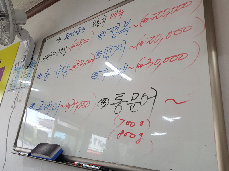 메뉴판을 보면서 오징어나 돼지두루치기, 가자미회무침 같은 메뉴가 있는 게 좀 낯설었어요.