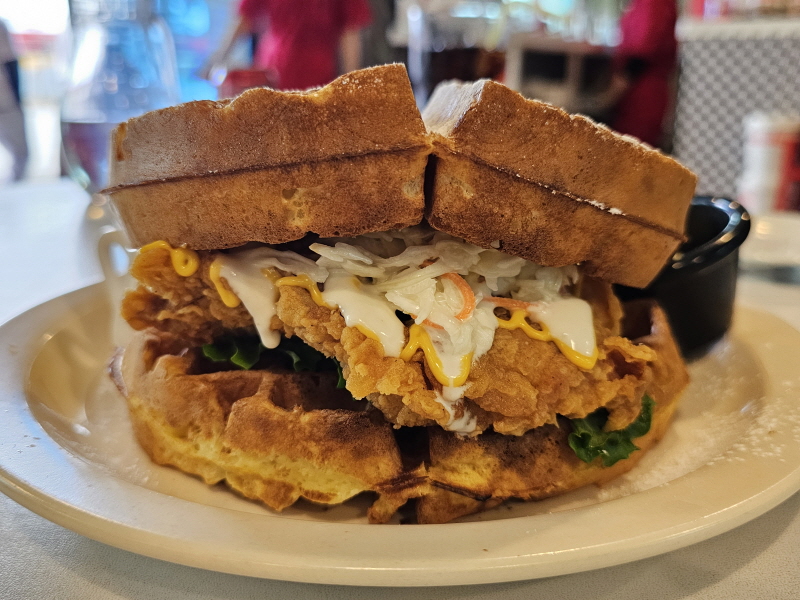 와플을 번 대신 사용한 치킨 샌드위치 혹은 치킨 버거라고 볼 수 있어요.