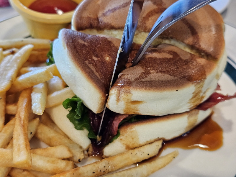버거라고 생각하면 시럽을 뿌려먹는다는 게 낯설지만, 팬케이크 라고 생각하면 시럽을 곁들이는 건 자연스러운 일이에요.