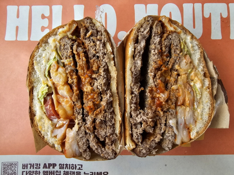 단점은 패티 자체가 워낙 두껍다보니 나름 열심히 잡고 먹어도 부재료, 특히 새우가 트레이도 툭툭 떨어지긴 하더라구요.