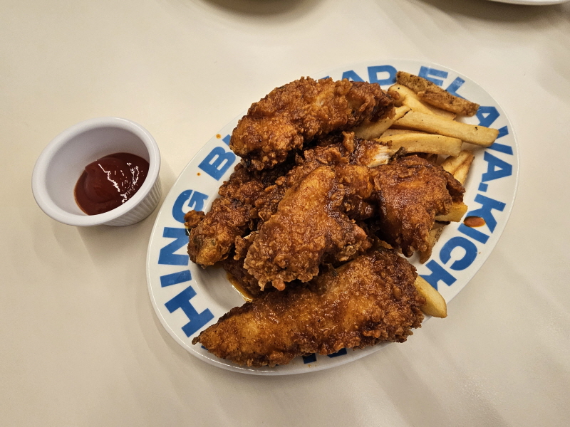 치킨텐더는 6조각에 감자튀김이 같이 나오고 약 1.5인분 정도라고 해요.