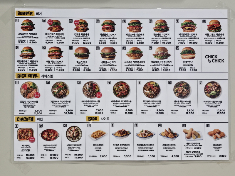 브랜드 이름이 Chick by Chick 이기도 하고 치킨버거로 유명해서 치킨 메뉴만 있는 줄 알았는데, 불고기버거 같은 미트 메뉴와 새우버거도 있어요.