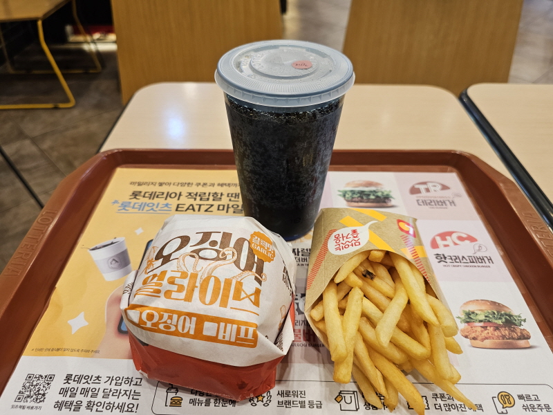 오징어 패티의 매콤함과 갈릭소스의 알싸함이 어울려서 튀김 패티지만 느끼함도 훨씬 덜하고, 매운맛처럼 매운맛이 강하지 않아서 저같은 맵찔이도 부담없이 먹을 수 있어요.