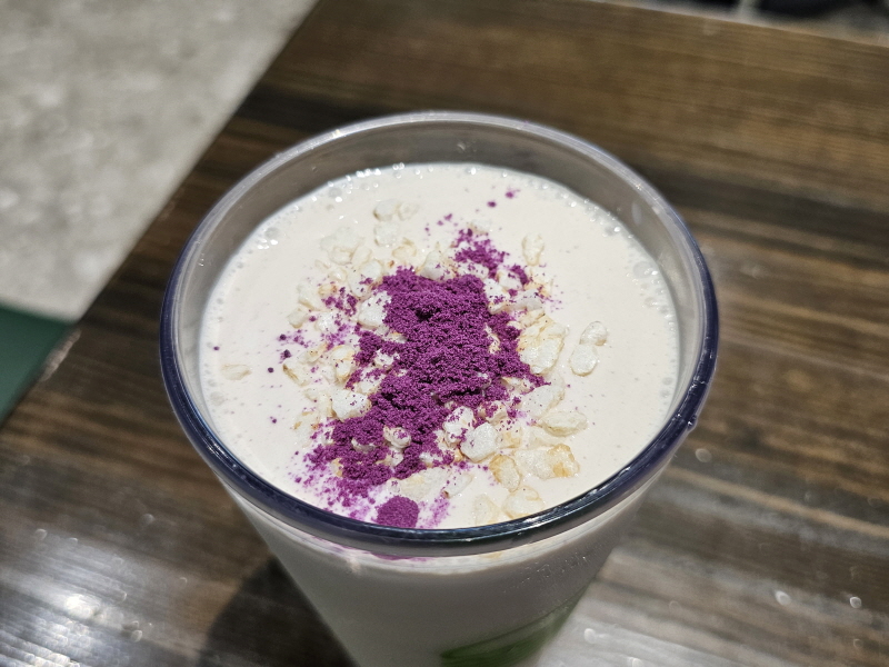 고구마 막걸리는 별도의 음료는 아니고, 막걸리 쉐이크 위에 자색 고구마 파우더와 라이스 토핑을 얹었어요.