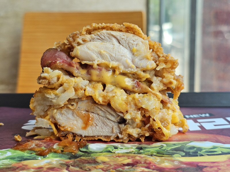 징거더블다운 통다리는 치킨 패티 2개와 해쉬브라운, 슬라이스 치즈, 살사소스, 배이컨, 페퍼마요로 구성되어 있어요.