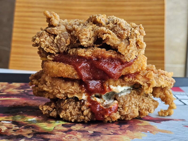 징거 해쉬 트리플다운은 치킨 패티 3장에 해쉬브라운, 파이어 칠리 소스, 마요네즈, 피클로 구성되어 있어요.