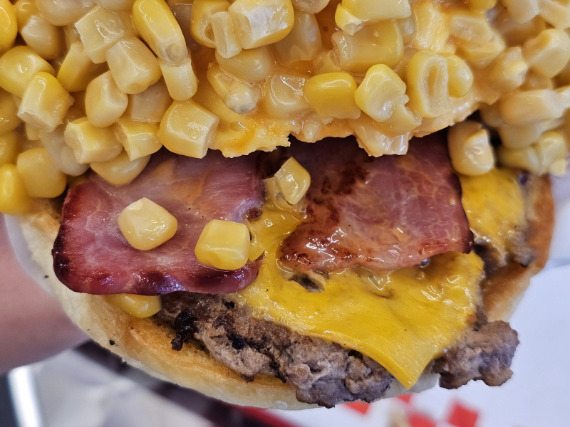 위에 올려진 스위트콘을 먼저 다 먹어야 그나마 나머지 부분을 편하게 먹을 수 있는데, 그러면 옥슈슈버거라는 의미가 퇴색되잖아요.
