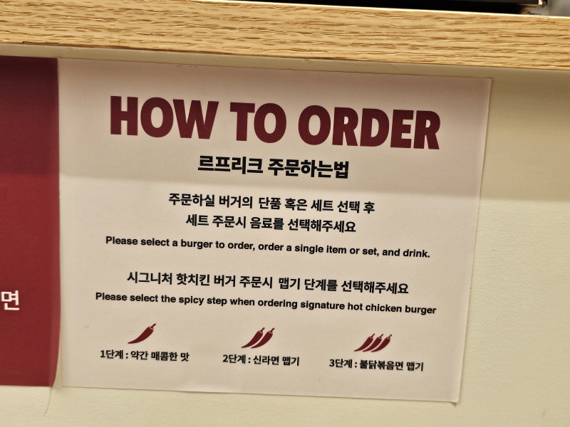 비슷한 내슈빌 핫치킨버거 스타일인 롸카두들은 소스가 아예 없는 0단계부터 0.5단계, 1단계, 2단계로 나누고 있는 거에 비해서는 매운맛의 단계가 덜 세분화되어있어요.