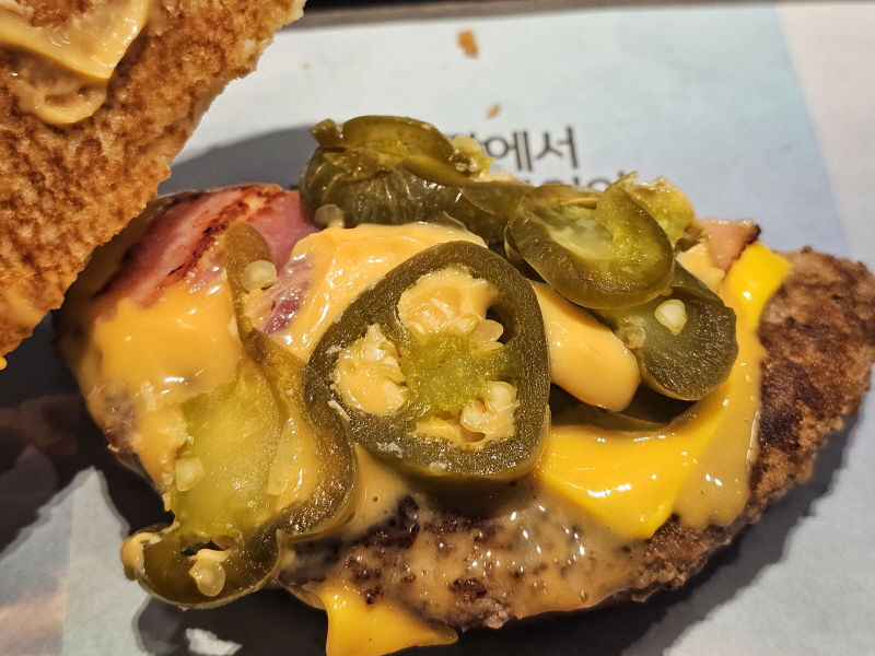 이 버거 자체가 크게 불만족스럽지는 않지만, 좀 덜 매운 할라피뇨를 넣거나 아니면 할라피뇨의 양을 줄이는 게 더 나았을 거 같아요.