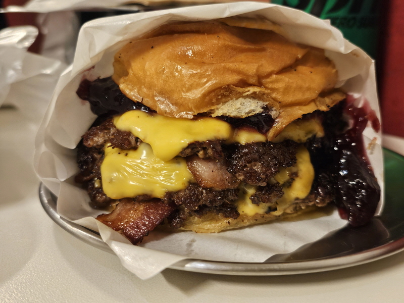 브리오슈 번에 쇠고기 패티 3장, 아메리칸 치즈 3장, 스트립 베이컨 2개, 포도잼과 땅콩버터로 구성되어 있어요.