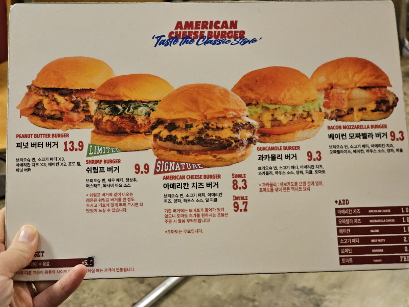 버거는 아메리칸 치즈버거, 피넛버터 버거, 쉬림프버거, 과카몰리 버거, 베이컨 모짜렐라 버거, 이렇게 5가지입니다.