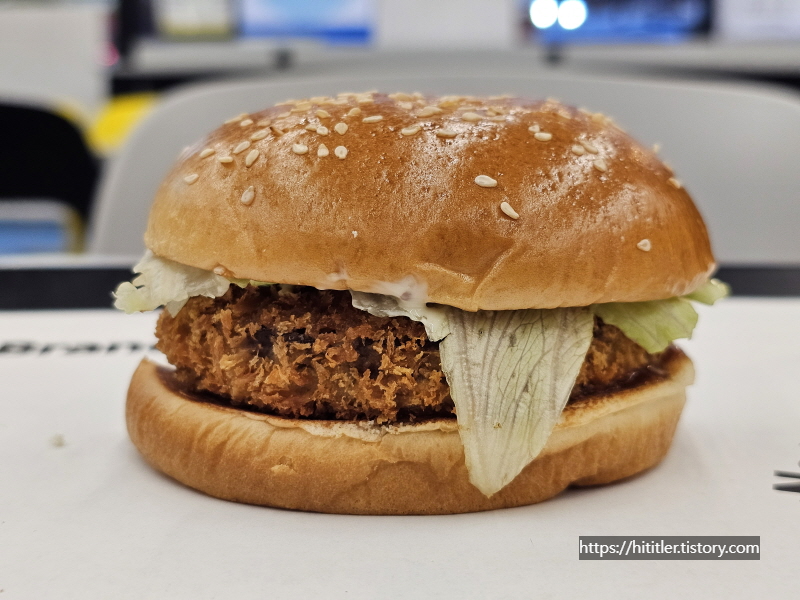 이 버거에 들어가는 패티는 다른 버거에 들어가는 일반 고기 패티가 아니라 카츠라고 해요.